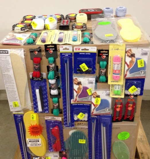 – 500 pièces de mercerie : aiguilles à tricoter, paires de semelles, lacets, fils, cirages